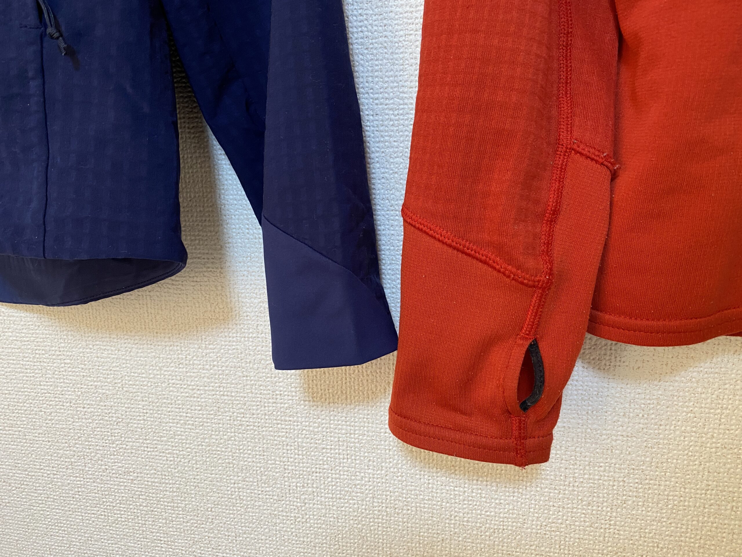 親指ループ付きなので寒い時に手の甲までを覆うことができます。シルエットは、R1プルオーバーの方がタイトなシルエットです。