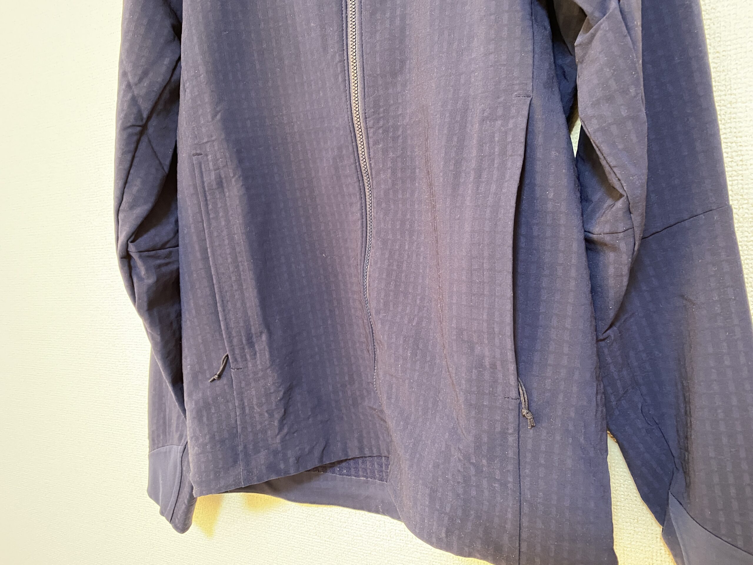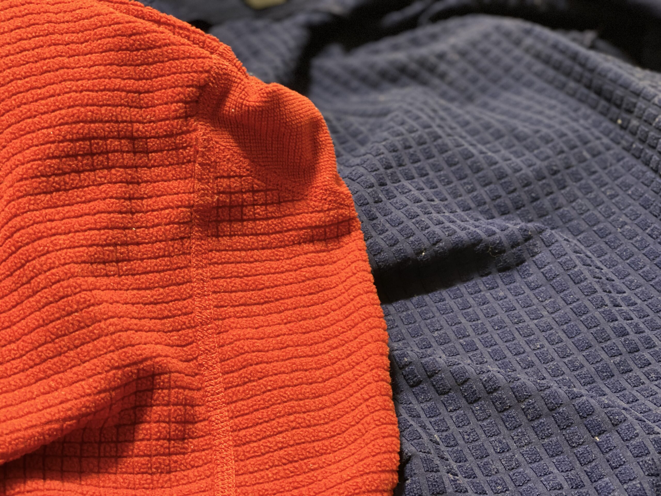 一方で、R1プルオーバーの方が生地に厚みがあり、保温性が高い印象です。裏面のダブル織の構造を見てみるとよくわかりますが、R1プルオーバーの方が厚みがあり、四角形と四角形の間の密度が狭くなっているため、その分の保温力が高いようです。通気性は高いですが、耐風、耐水性はないので、風が強い時や悪天候時にはアウターの着用が必要になります。