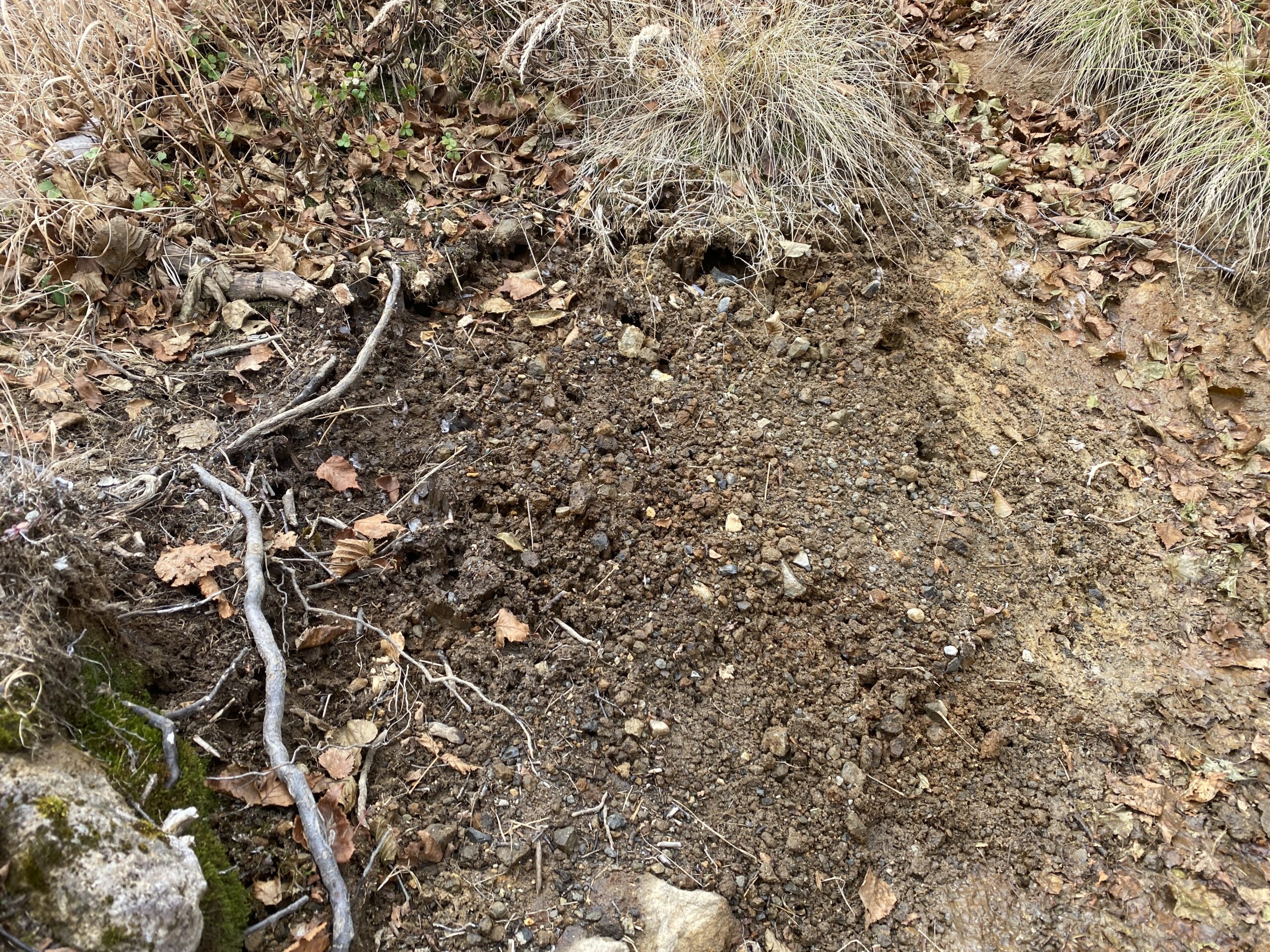 またこの時期の標高が高い場所では夜になると寒いときでは氷点下になり土に霜が降りているのが見受けられます。その霜柱が溶ける際に土壌を侵食していきます。これを「凍結融解現象(とうけつゆうかいげんしょう)」といいます。